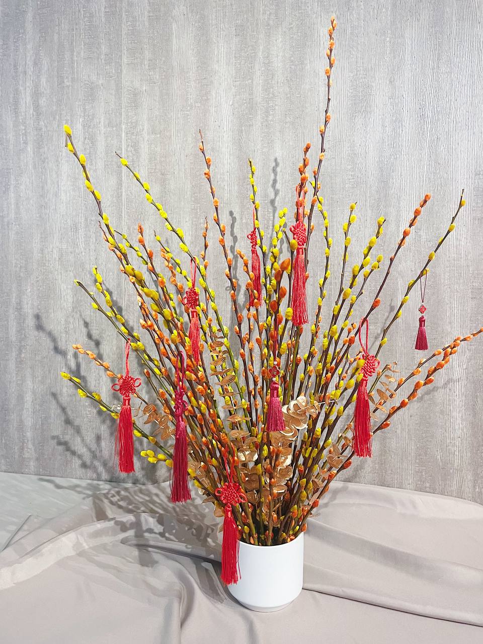 Sunny Yellow and Orange Pussy Willow flowers in a White ceramic pot adorned with 10 ornaments.
