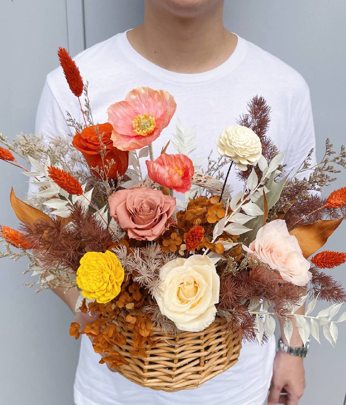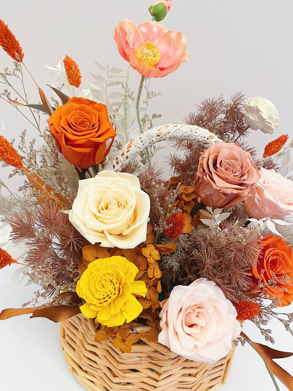 The Magnolia Preserved Basket is an autumnal themed basket arrangement that is everlasting; works well as a bedside table decor or table centrepiece. It features preserved roses, preserved mint, preserved ruscus, faux poppy flowers as well as sola wood flowers and other filler flowers.