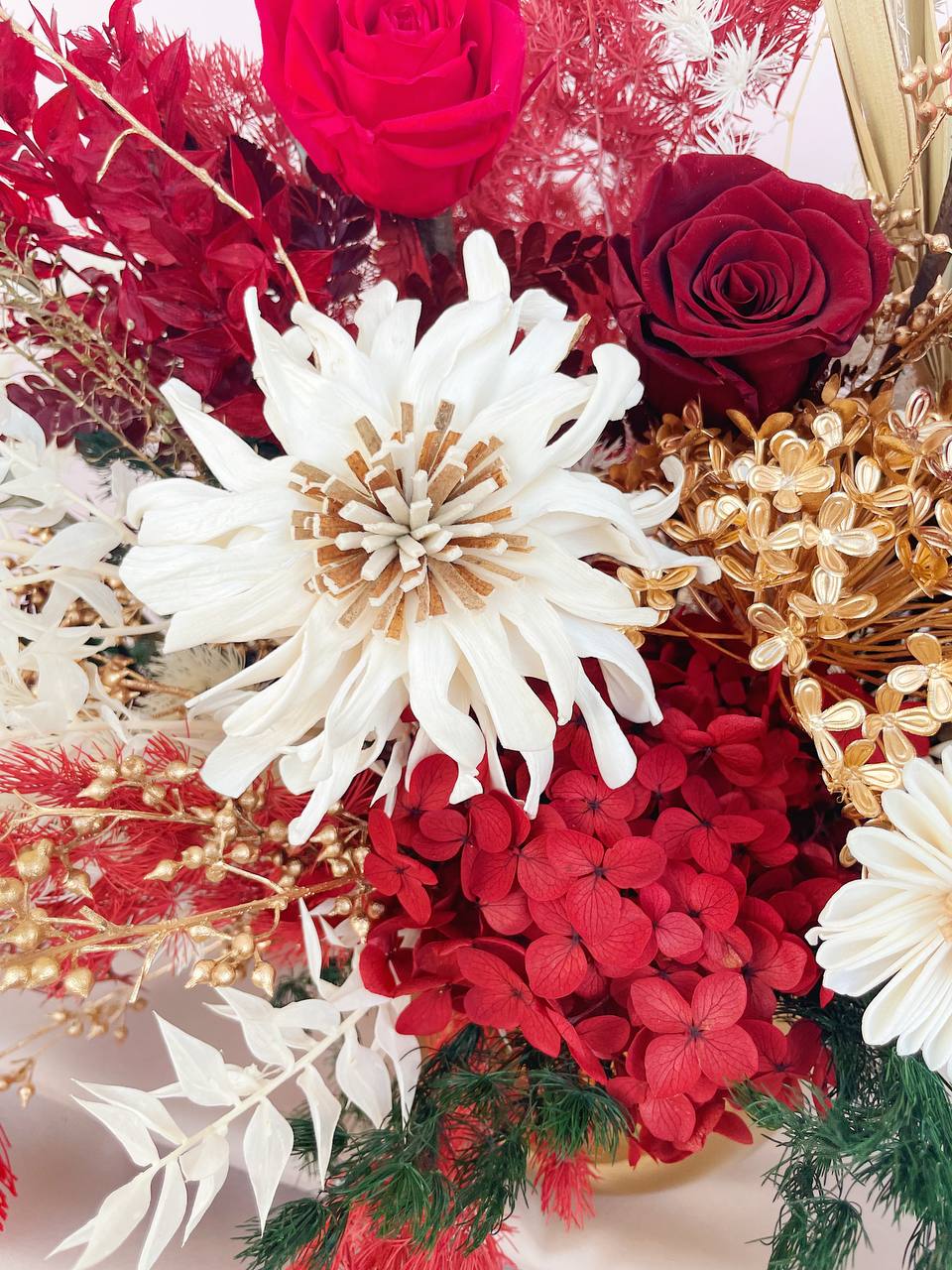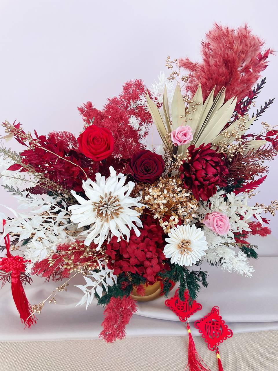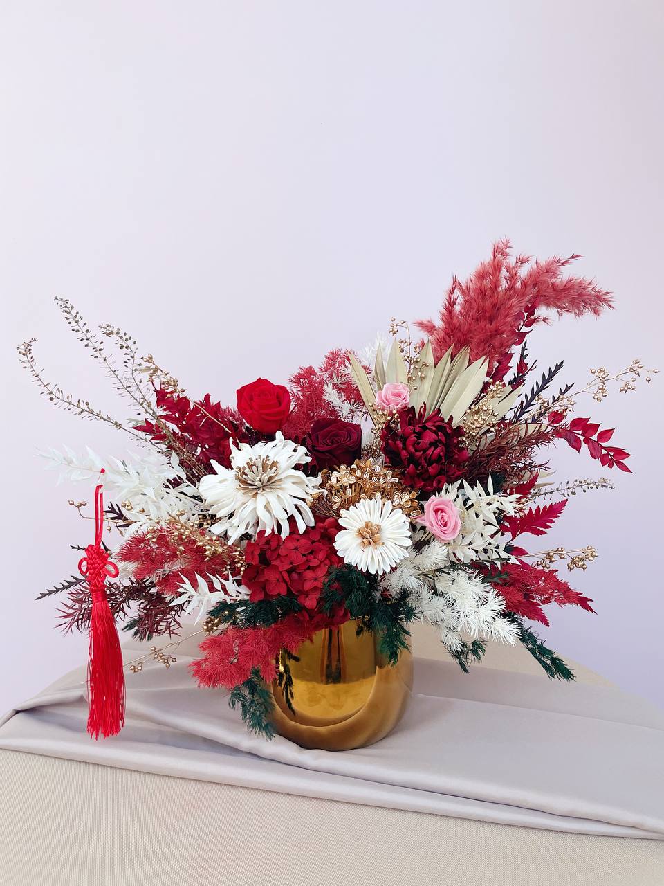 Our Prosperity arrangement in Gold pot is filled abundantly with faux peonies, sola wood flowers, preserved mint, pampas, preserved fern, preserved ruscus, preserved roses and preserved hydrangea, along with other filler flowers.