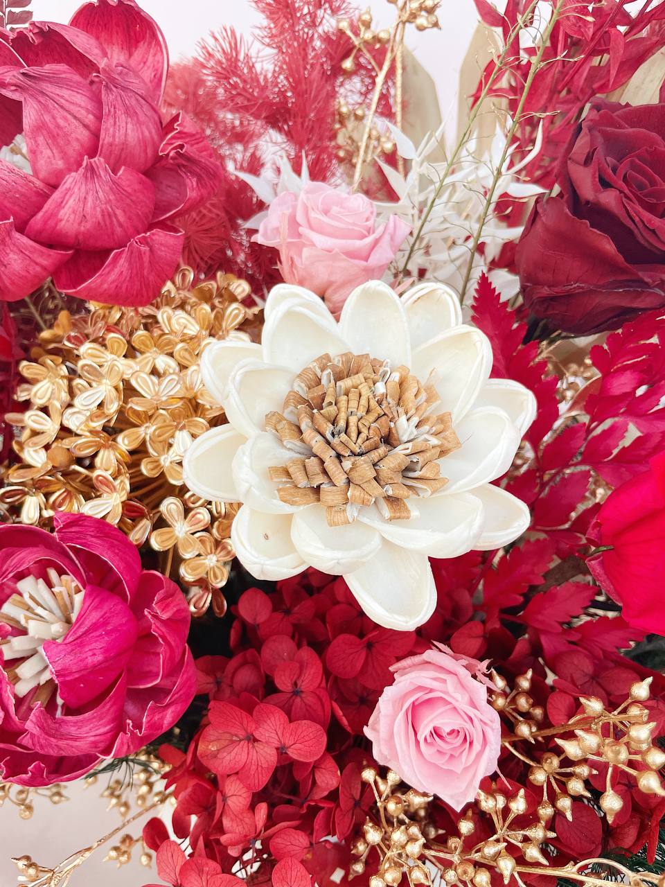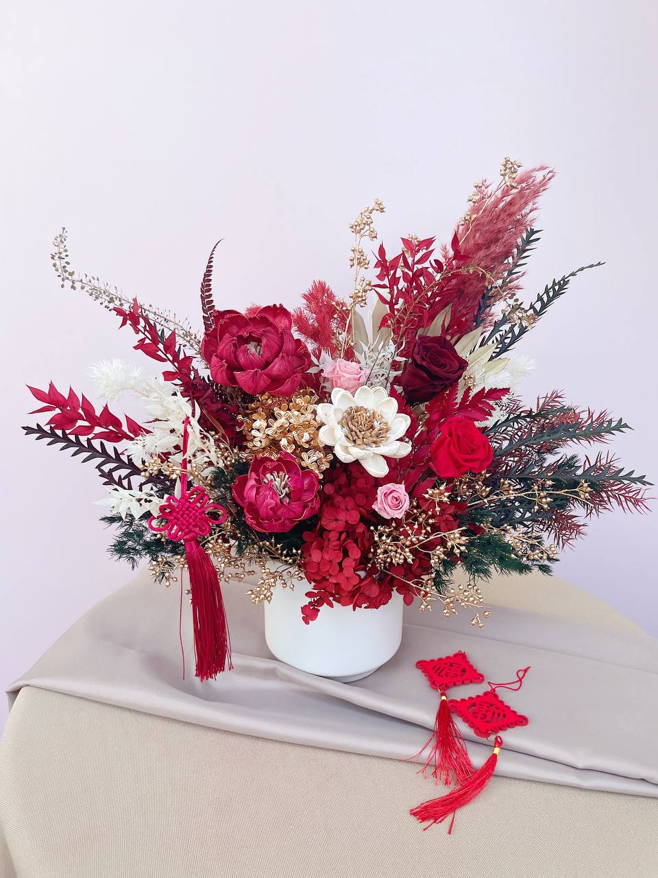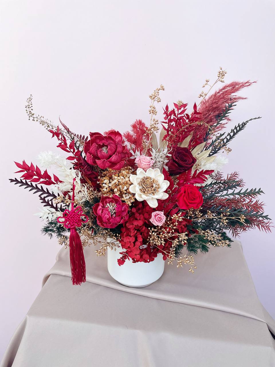 Our Prosperity arrangement in White pot is filled abundantly with faux peonies, sola wood flowers, preserved mint, pampas, preserved fern, preserved ruscus, preserved roses and preserved hydrangea, along with other filler flowers. The perfect colour and flower combination to brighten up your house and bring in prosperity to you and your family.