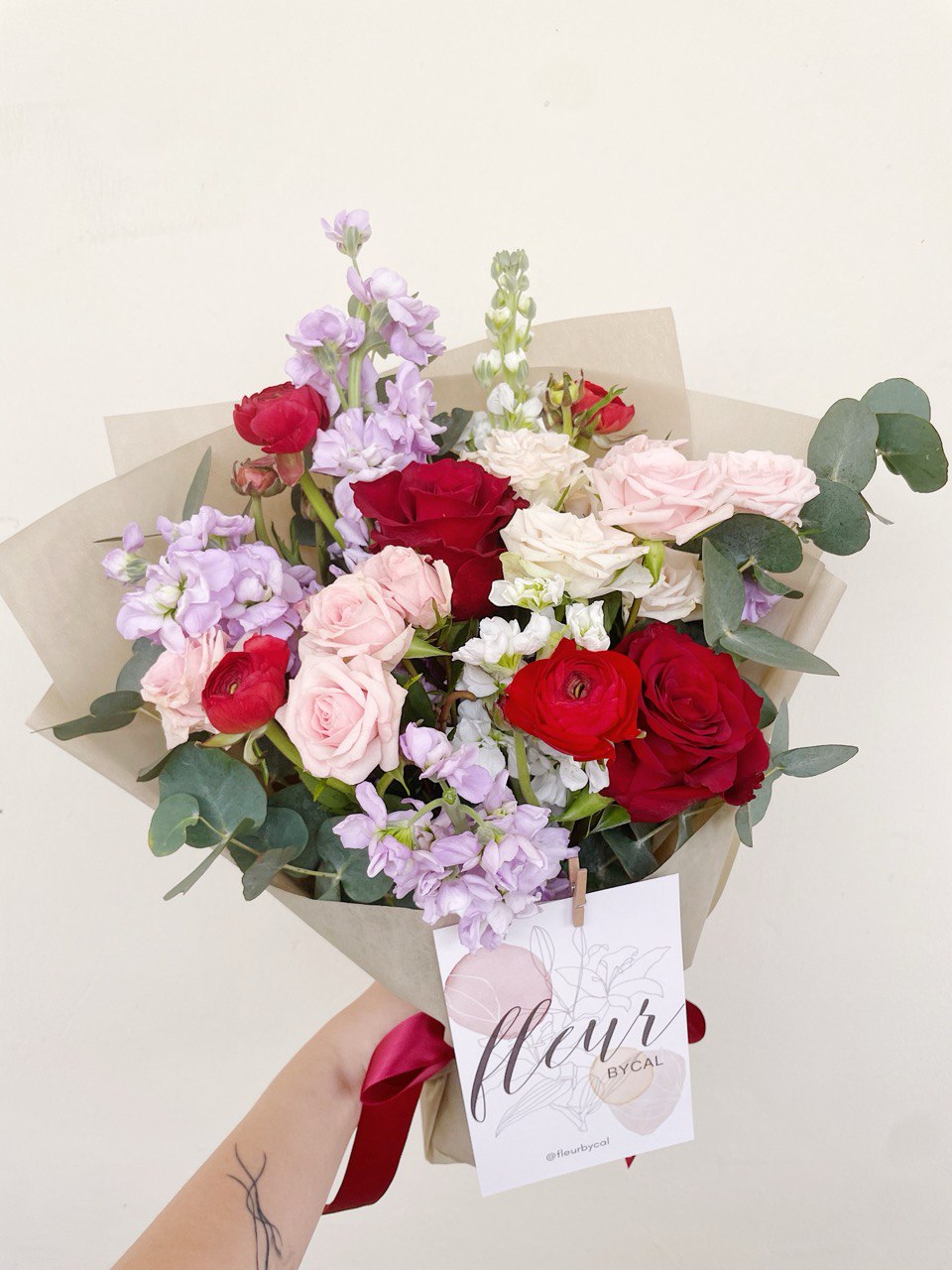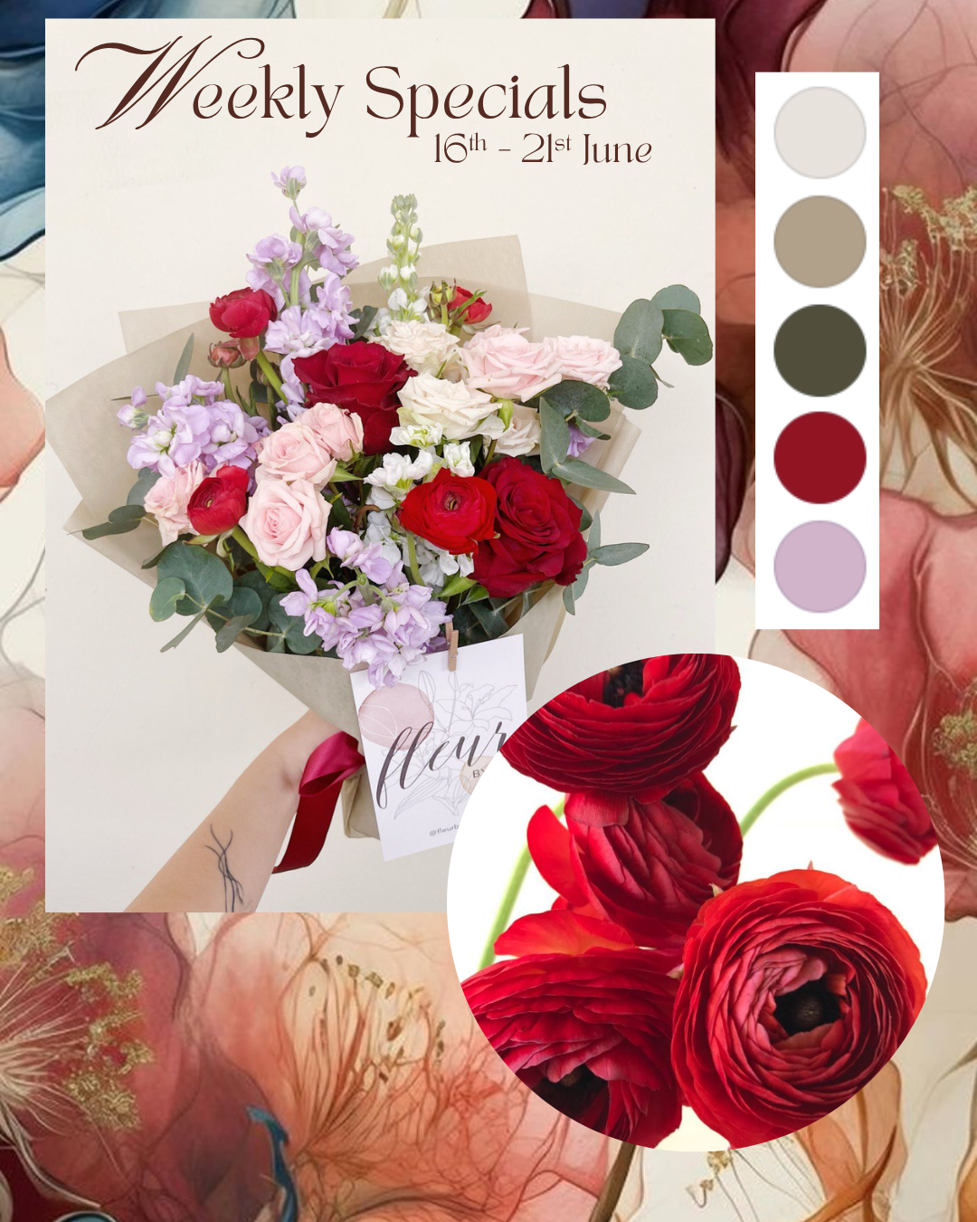 This week's specials features red kenyan roses, wine ranunclus, lilac matthiolas and cream spray roses.